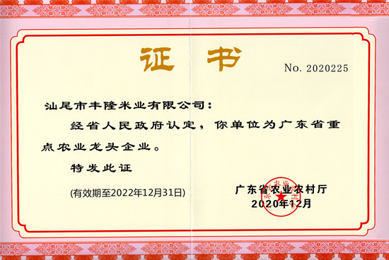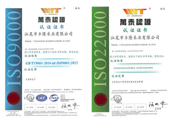 作为广东省重点农业龙头企业之一,我公司目前已注册 “丰隆”等商标多个,自有大米品牌 2个,均已获得有机产品认证、无公害农产品认定证书。其“丰隆银粘”品牌在 2019 年 被广东省“十大名牌”系列农产品评选委员会评选为广东名米,“丰隆家家乐大米”品牌被评选为广东省名特优新农产品。我公司并配备一支业务技能扎实、服务意识强,工作效率高的高素质、高水准运营团队,积极进行品牌宣传推广,在粤东、深圳等珠三角地区都有稳定的销售渠道。目前,我公司已通过食品安全管理、质量管理、环境管理等多个体系认证,确保食品的质量安全。在自有注册商标“丰隆”的基础上,持续进行品牌推广。